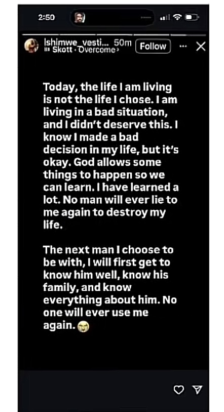 Ibi Vestine yabigaragaje abinyujije mu butumwa yashyize ku mbuga nkoranyambaya ze zitandukanye aho yanditse mu rurimi rw’icyongereza agaragaza ko gushyingiranwa n’Umugabo we ari amahitamo mabi yakoze mu buzima bwe.